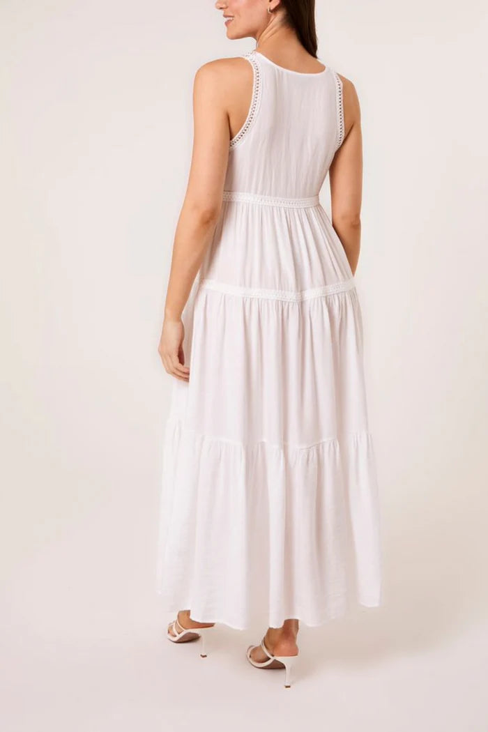 The Amaléa Maxi Dress draws inspiration from classic Grecian silhouettes, reimagined for modern women who seek beauty in movement. Its tiered skirt, delicate crochet-trimmed seams, and plunging V-neckline balance softness with structure — made for warm evenings, seaside getaways, or special occasions.