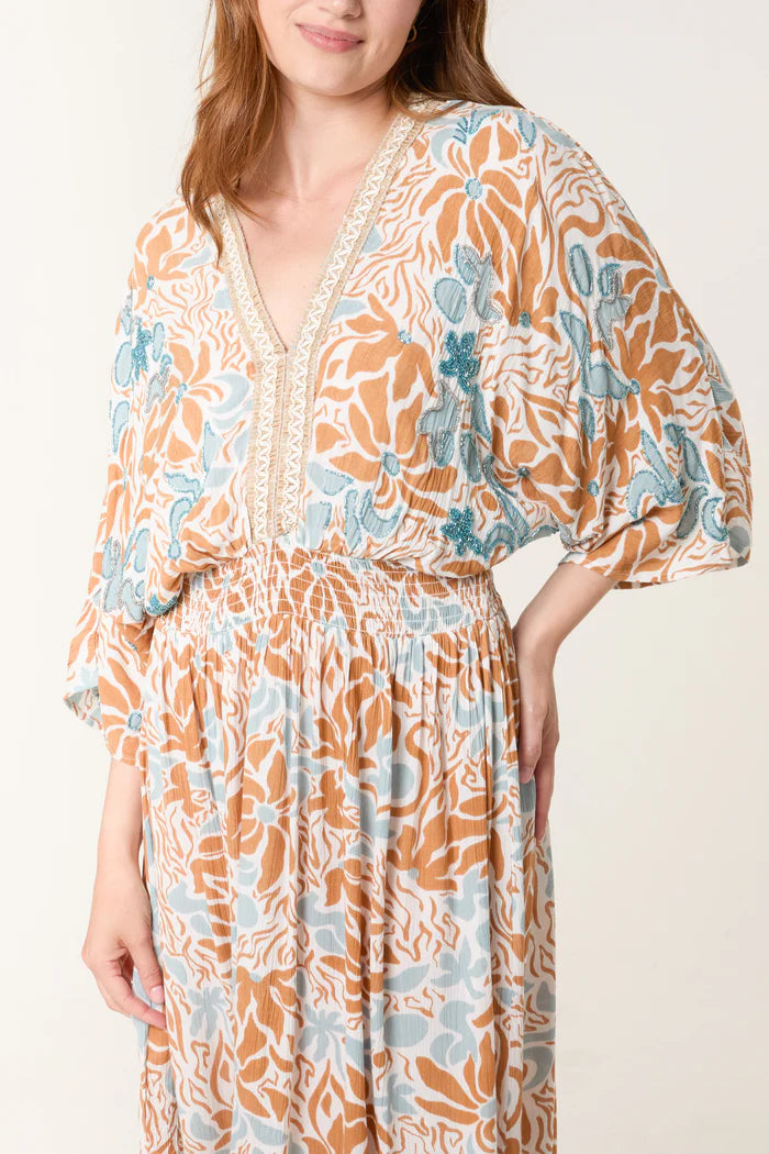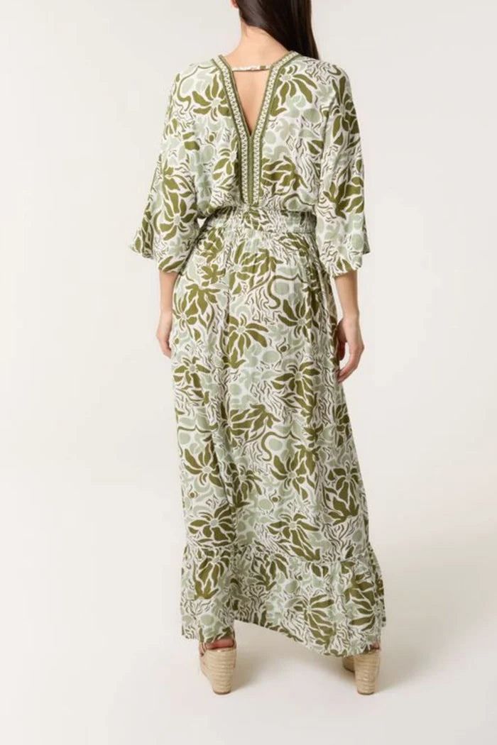 The Willow Maxi Dress is designed for freedom — in movement, mood, and fit. Featuring a mirrored V-neckline on the front and back, voluminous batwing sleeves, and a gently tiered hem, this dress is equal parts ease and elevation.